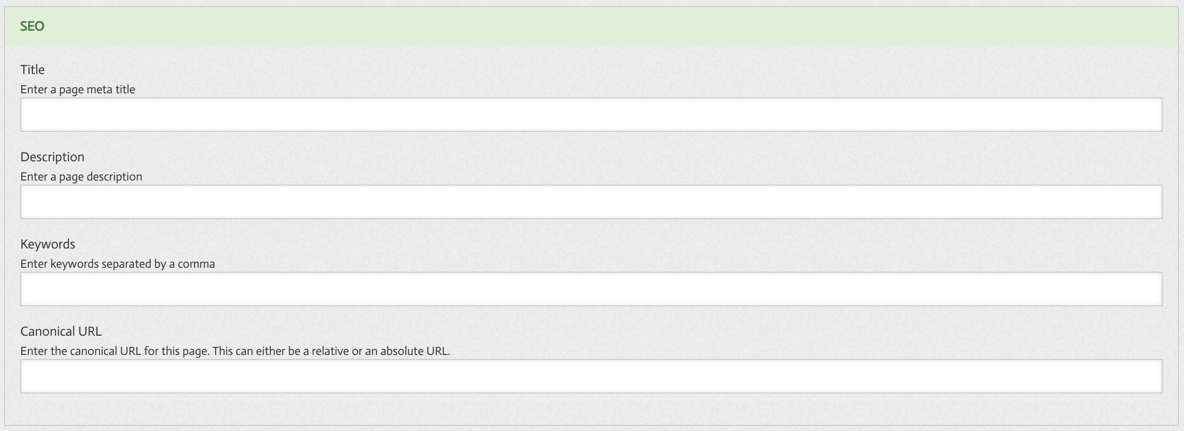 Each content item that uses the SEO part, includes the following four input fields - Title, Description, Keywords, Canonical URL (as shown below).